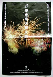 ここは、陸と台船が2カ所の、合計3カ所からの花火があがります。 陸上は丸玉屋担当で、10カ所からの虎の尾やスターマインがあがります。 海上はお台場側が丸玉屋、竹芝側がホソヤエンタープライズが担当し、 尺玉までの単発やスターマインがあがり、競演しています。 今年のプログラムには、花火の型名の解説と共に、両社長の顔写真とコメントが載っています。 繊細な丸玉屋と、豪快さの細谷だそうですよ!!確かにそのような感じが・・。