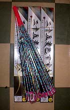 <<その他、流行といえば・・>> 今までススキでは20色変化が一番最高の種類でしたが、今年は何と25変色ススキ が登場。燃焼時間は2分15秒ととっても長く、飽きてしまうかもしれません。(^^; あと今年の発売ではないですが、火をつけて少したつと足がびよ〜んと開いてぶらん ぶらんするたこおどりとか、花火が燃えていくと、スカートがパラリとめくれる、 OH!NO!マリリンがうけるでしょう。 あとは、下から上へ燃え尽きた花火がまた逆に戻ってくるもの、強烈の光を発する物 等でしょうか。でも線香花火も忘れてはいけませんね。 25変色ススキ:350円 たこおどり:150円 マリリン:300円 |