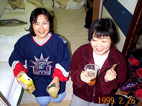 <hey-chanの99ニセコスキー>内容hey-chan企画のスキーツアーで、僕の飲み友達仲間であるルートクラブを始め、各メーリングリストのお友達を みんなまとめて連れていこうと言う企画。hey-chanのスキーツアーは、食事の時間以外は、一切フリーです。 今年でこの企画を3年目となりました。思いっきり滑って、温泉入って、思いっきり宴会して、花火も揚げてと言う企画です。 僕が元気な限り、毎年行いたいと思いますので、よろしかったらまたの機会もきてちょーだい。 ちなみに、僕の職業は、ツアコンではございません。;P 場 所 : ニセコ国際ヒラフスキー場 ※積雪量・雪質は抜群!! ※共通券で、ニセコヒラフ高原・花園・アルペン、東山、 アンヌプリと言う巨大エリアにアクセスできます ※元気があれば、8:30~21:00まで滑れます。^^; ※高原のナイターは、終了少し前までゴンドラが動きます ※ゲレンデ脇でちょっと豪華な花火を打ち上げます 日 程 : 1999年2月25日(木)〜2月28日(日)(3泊4日) 宿 泊 : 山田温泉ホテル(ひらふ高原・アルペン徒歩0分) ※天然温泉付きの宿ですよ(ちょっとぼろいけど^^) ※スキー場へのアクセスは、ヒラフ一番 ※食事はバイキングで、まぁ普通??? ※酒は宴会部屋^^?にいっぱい持ち込み(*^^*) メンバー: hey-chanと愉快な仲間達 人 数 : 羽田発27名・伊丹発5名・現地3名 費 用 : 羽田発 50000円 伊丹発 54500円 (3日分の宴会費・花火代を含みます。今年は宴会費、足が出ましたけど。^^;) 以下のコメントは、僕が各MLに流した物をmukuさんがhtml化し、それを盗んできて、手を加えました。^^ 参加者のページは、以下にあります。mukuさんはカメラマン、関谷さんはビデオマンをやっていただきました。どうもありがとうございました。 昨シーズンのレポートページは、こちらにあります。 mukuさんのHP 「heyちゃんニセコツアー」 関谷さんのHP 「スキー場レポート」 「2月25〜28ニセコ」 「カバさんページ」 「トレイン」 25(木)晴れ 東京組は、12時50分に宿の山田温泉ホテル着。空港から宿までの貸し切りバスに、 「ヒラバヤシトモユキ様」と、フルネームで書かれていたのには、おいおいと言う感じでした。 ツアー会社には、hey-chanニセコツアーって書いているのにぃ。 千歳空港で、あまり天気が良くなかったので、あちらは雪かと思いきや、何やら途中からこうこうと日がさして、 道路の雪が解けている状態でした。すぐに着替えてゲレンデにでたけど、とても暑く、シャーベット状態でがっくり。 雪も何だか降っていないようだし・・・・。;-( 着いたときは、−2℃くらいだったかなぁ??羊蹄山が綺麗に見えました。 パウダー仲間とスキー場内と化したシュプールだらけの東尾根を1本滑るも、とっても滑りにくくて、やめにしました。 その後は、近くにいたニセコお初のメンバーをだだっと全山案内。かっ飛びモードで、花園から、アンヌプリへ、 そして東山、アルペン、高原と短時間で制覇。^^; 夕食を食べて、8時までナイターやって、温泉に入って、大宴会。酒の量の見積もりの甘さにちょっと反省。 26(金)晴れ 晴れなので、朝からカバモード。 朝一番から、ビステンのかかったがらがらの高原ジャンボコースで彫る彫る。 すんげー気持ちよかった。その後花園ダウンヒルAで彫り彫りし、人が増えたので、下まで行って休憩。 既にカバさんはお腹いっぱいでありました。午後より、アンヌプリチャンピオンコースで、みんなの滑りの写真&ビデオ撮影会。 カバじゃないメンバーは、目を点にして僕らの滑りを見ていた様です。 その後適当に滑って、夕食を食べて、ナイターちょっとやって、温泉に入って、大宴会。 この日は、北海道の民に毛蟹さんを買ってきてもらって、贅沢な宴会のつまみでありました。 また、一人がこの日、三十路の誕生日って事でちっこいケーキに30本のローソクたてて、お祝いしました。 感謝感激で、うるうるしていましたよ。^^ 27(土)雪→猛吹雪 ちょっとぐさぐさだけど雪が積もったので、上はパウダーにありつけるかな?と思っていたら、 な〜んと上は朝からホワイトアウト。一番下のリフトしか視界がないの(;_;) う〜、つまんないよぉ。 この日、地元カバと、ジャンキーズがやってきたのですが、雪が悪くて、いまいちの状態。 昼前になって上空がちょっと見えるようになったので、食事後にアンヌプリでも行こうかと思ったら、 突然の猛吹雪。視界が無い。コースはどこじゃ〜〜。 やっとこせっとこ、宿までたどり着き、休憩。ちょっとおさまって外に出るも、上の方は猛吹雪。即刻退散。 夜になって風がおさまり、花火をあげました。綺麗でしたよ。その後、ファンスキーでナイターに行きましたが、 雪が積もっているのと雪質の良さに、にんまりして終了。でも寒かった。 温泉に浸かって、大宴会。この日は、僕は知らぬ間に熟睡。^^; 28(日)猛吹雪 今日の雪はいいぞ〜と思いきや、なんと、ゴンドラやフード付きクワッドが、止まっているではないかぁ。今回は終わりかぁ。(涙) 