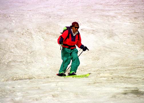 ひゃっほー。山頂に荷物を置いての滑走です。
